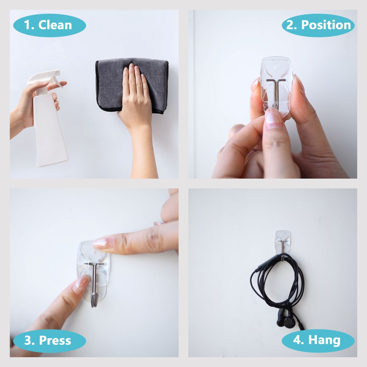 Hang clipboards, brushes, dog leashes, kitchen utensils, keys and accessories where you want without nails or a hammer.